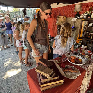 Au cœur du public de passage, je propose des énigmes et des défis à résoudre dans le décor en manipulant tous les objets : le programme s'adapte selon l'affluence, l'âge, la curiosité des passants et l'humeur de la sorcière !
